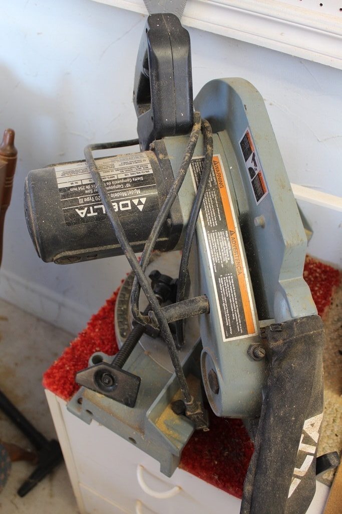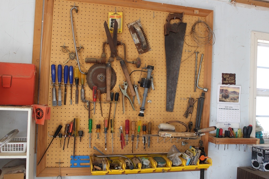 Craftsman Mechanic Stool, Delta Bench Grinder, Bench w/ vise, 2-Workmate Benches, 2-Shop Vacs, Rockwell table saw, Dewalt Router, Delta Mite Saw, 32’ extension ladder, 20’ extension ladder, 6’ AL Step Ladder, 3’ Step ladder, Misc. Lumber, Pipe saw horses, 4 Priefert 10’ Panels