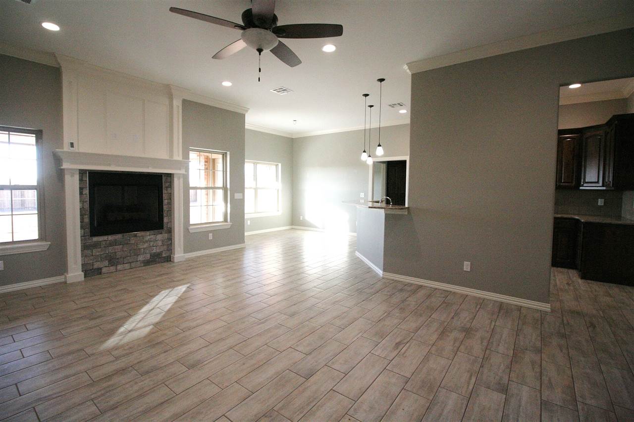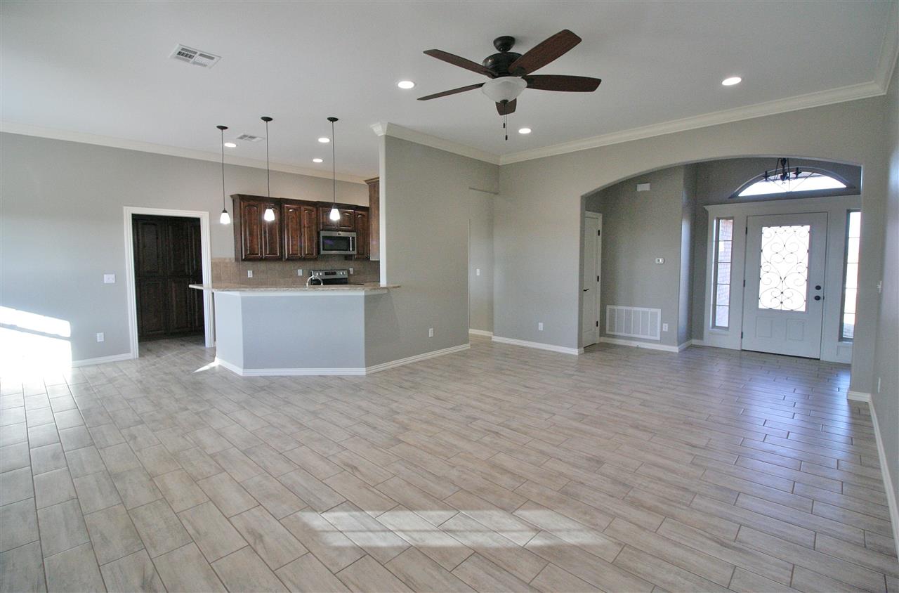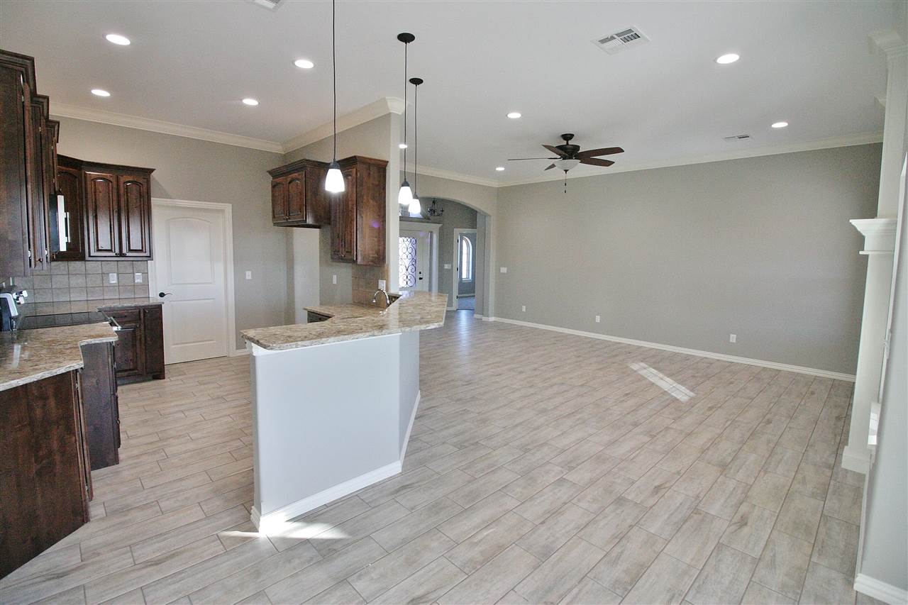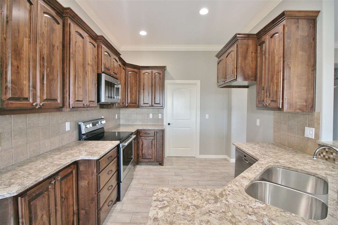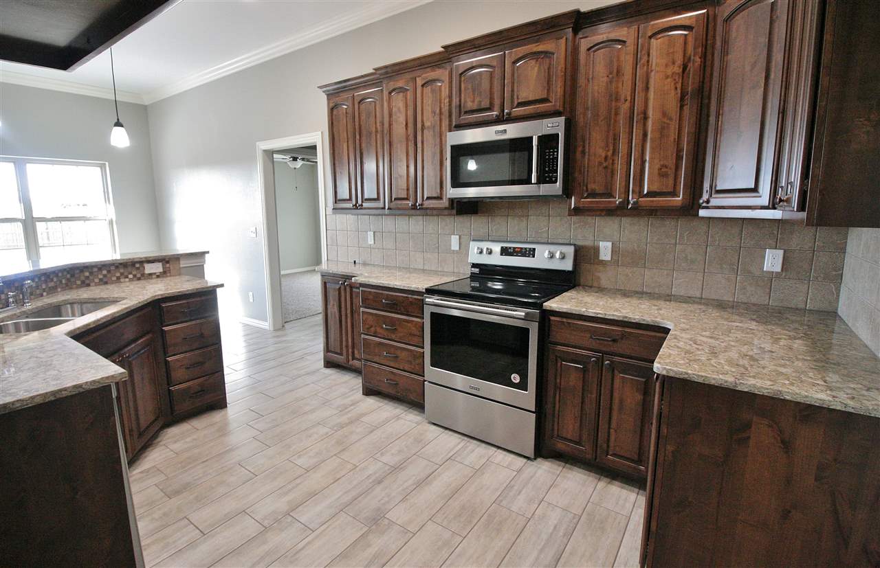 This open-kitchen concept home offers 3 bedrooms, with office or 4th bedroom, 2 baths & a 3 car garage with in-ground storm shelter. Walk in to a foyer with coat closet then step in to the grand living room with fireplace. Enjoy the 10 ft ceilings throughout and trace ceilings in the master bedroom. The master bathroom boasts of a large corner soaker tub & separate tiled shower, 2 separate vanities and huge walk-in closet. Beautiful custom cabinets throughout! Large fenced in backyard with sprinkler system.