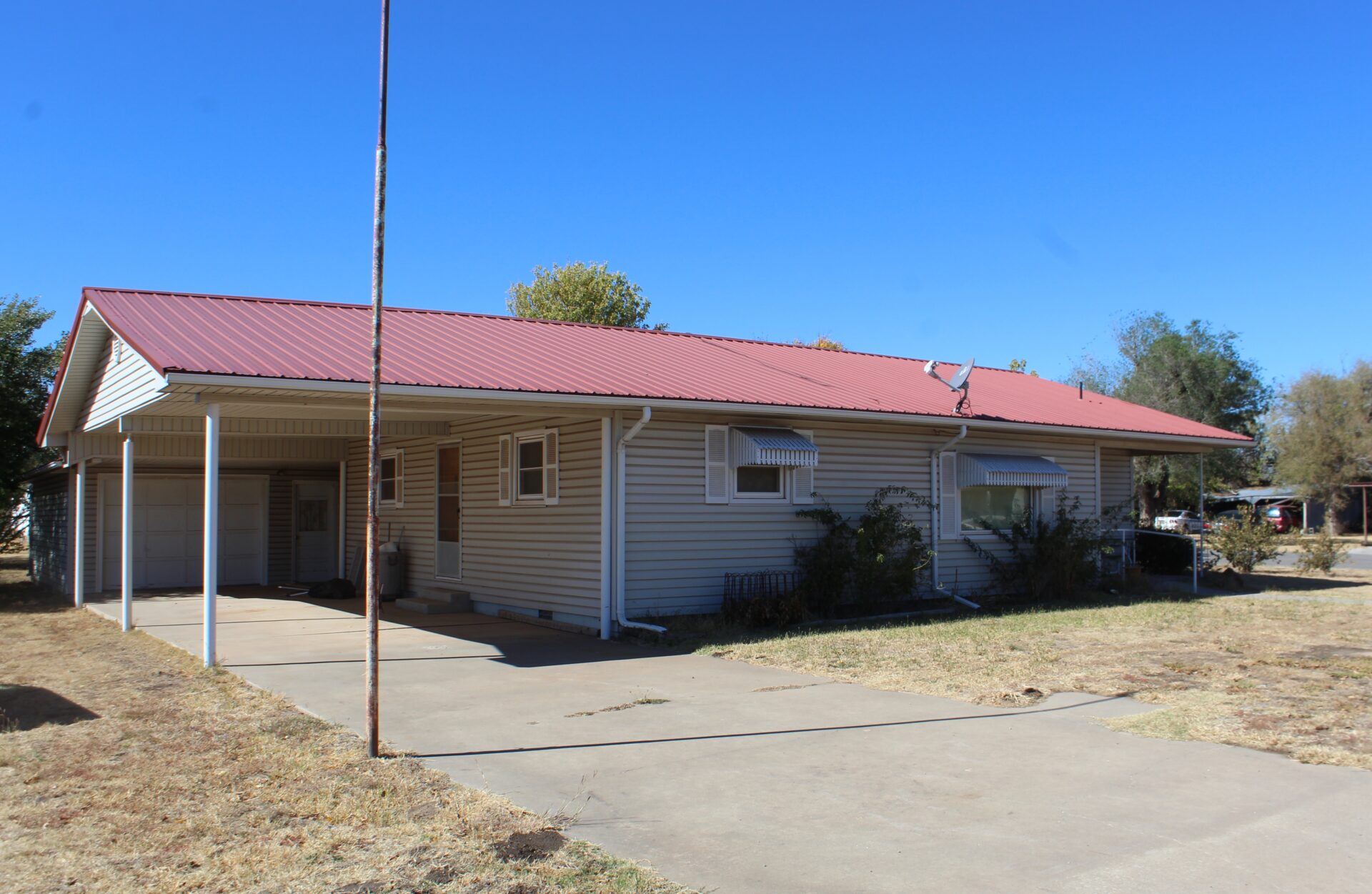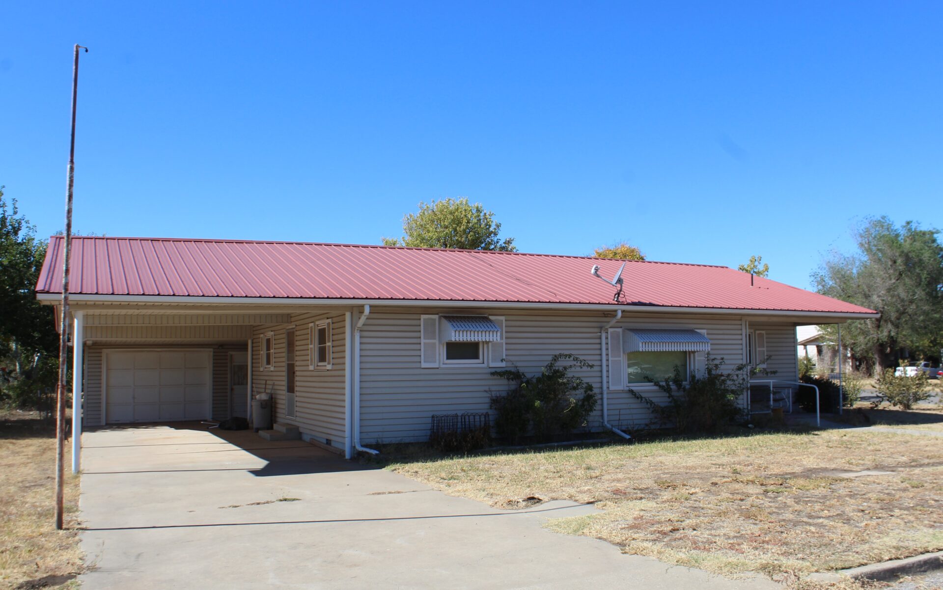 This is a very well maintained home on a corner lot. Dewey County Assessor reports 1,272 sq. ft. of living space. The home has two bedrooms, two bathrooms, living area, laundry room, and a kitchen with custom built cabinets by the late Charlie Barr. In addition, there is a cellar with access from the laundry room. The home has a vinyl siding, vinyl windows, central heat/air, and a metal roof. There is an attached carport, two covered porches, a detached oversized garage and a storage building with concrete floor. The home is located in a quiet neighborhood at the corner of 7th and Holmes.